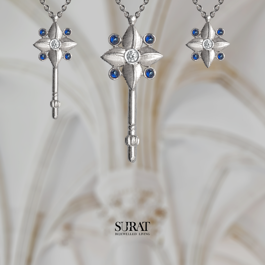 8 Cabochon cut sapphires weighing a total of .40ct set around a centre of .10ct round brilliant cut diamonds on both sides render the clover shape that appears in the arches and their windows.